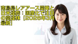 ニュースまとめ 南鳥島レアアース開発と日米連携:国産化で注目の関連株【2026年3月最新】 資源大国への夢か?南鳥島レアアース開発と日米連携の最新動向「日本の海底に、世界屈指の鉱床が眠っている」——そんなニュースを聞いて、あなたはどんな未来を想像するでしょうか?電気自動車やスマートフォンなど、私たちの生活に不可欠なレアアース。その... 2026.03.21 ニュースまとめ